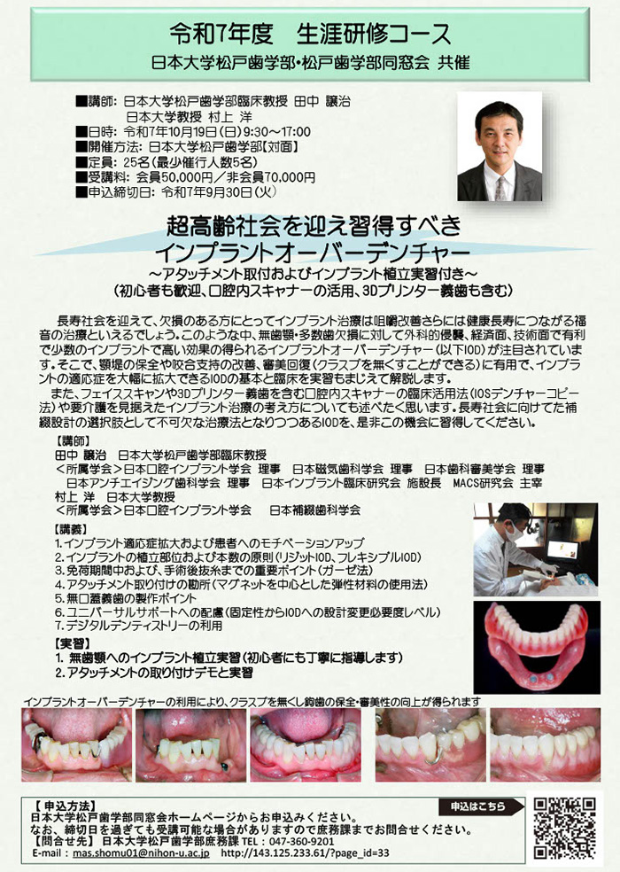 磁性アタッチメントを利用した中心としたインプラントの臨床応用セミナーを平成16年より開催しております。セミナーでは有用性や利用方法、臨床の勘所等についての解説とともに、多くの臨床例の供覧により臨床応用テクニックを修得していただきます。